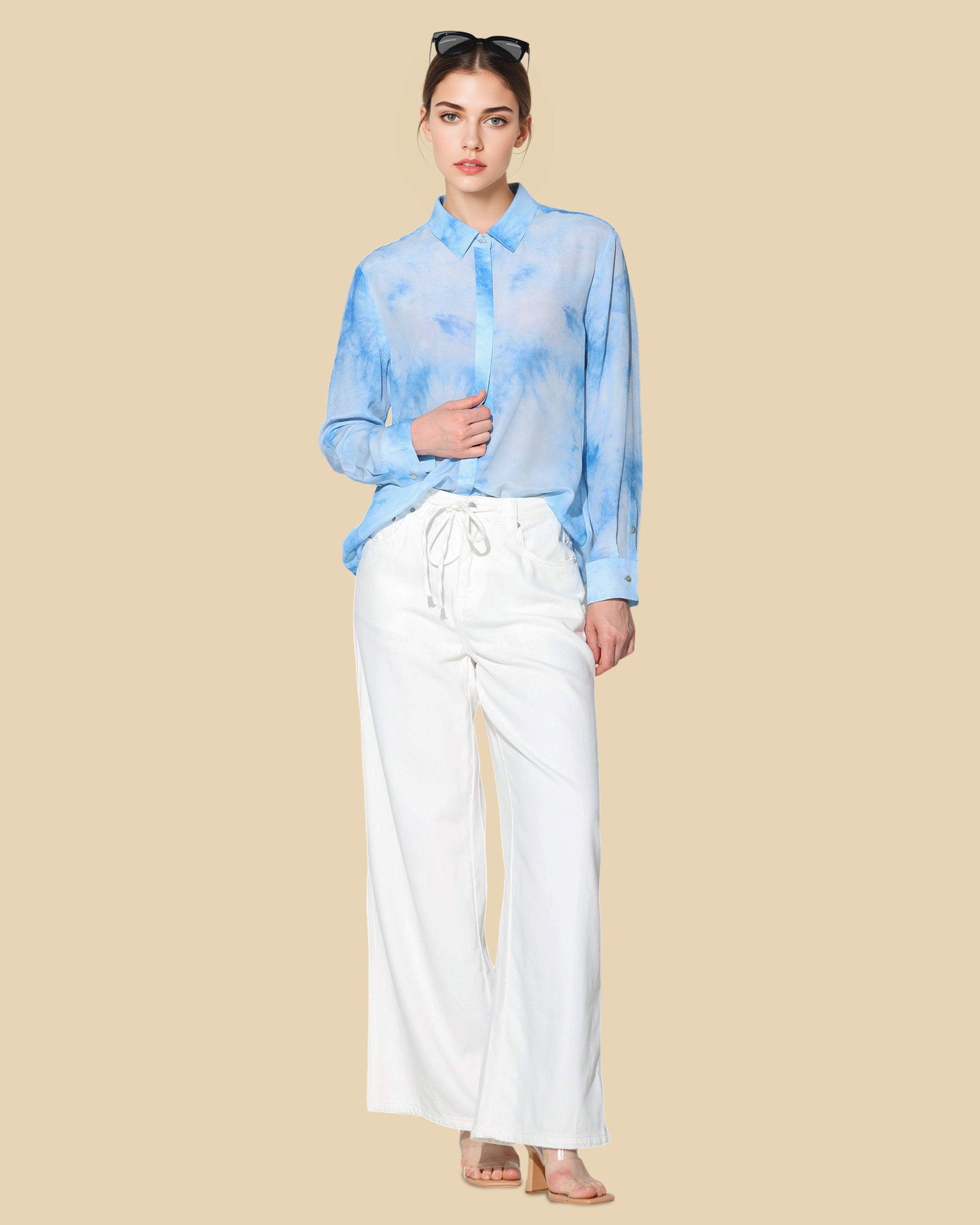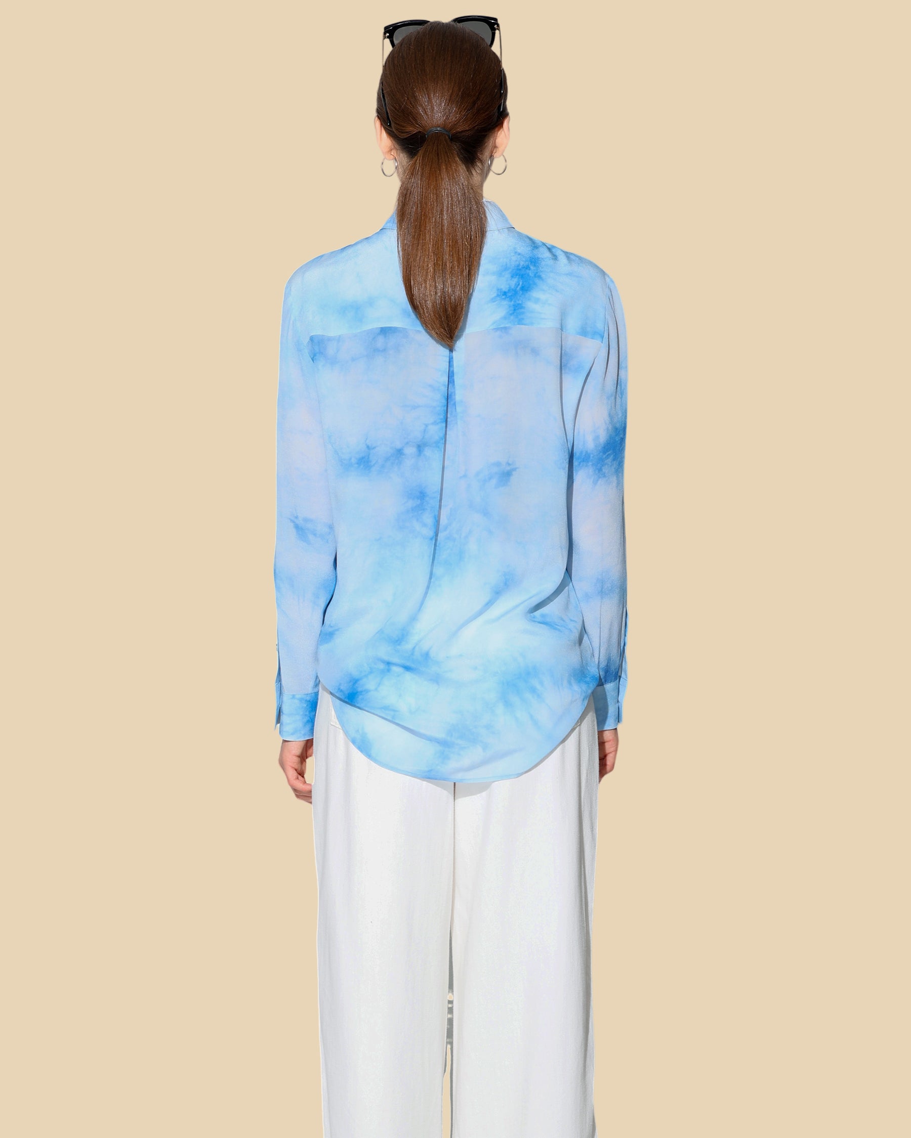The folded placket adds a refined touch, accented with blue enamel-dyed buttons that echo the watercolor-like dye pattern. Soft shades of azure and sky blend fluidly across the fabric, creating a visual effect as calming as ocean ripples.