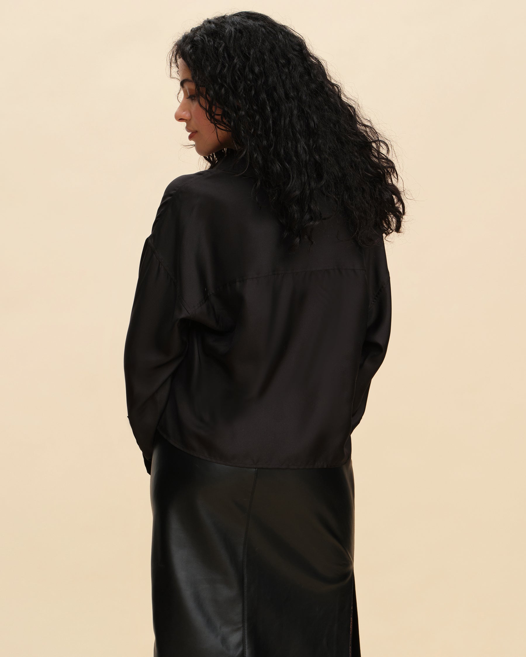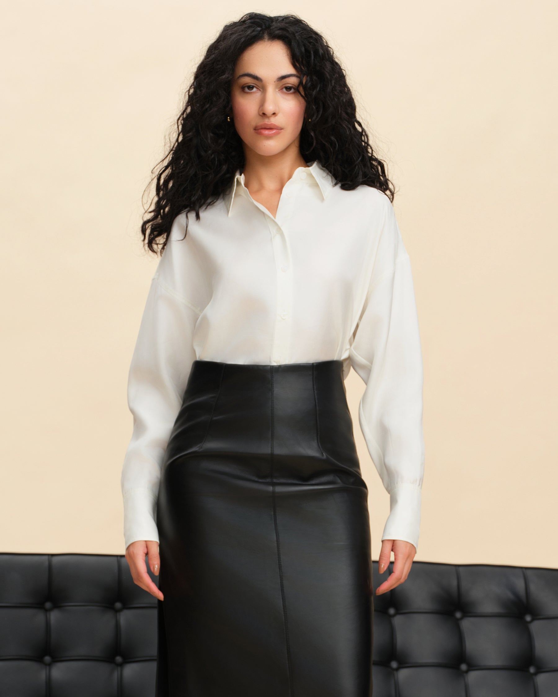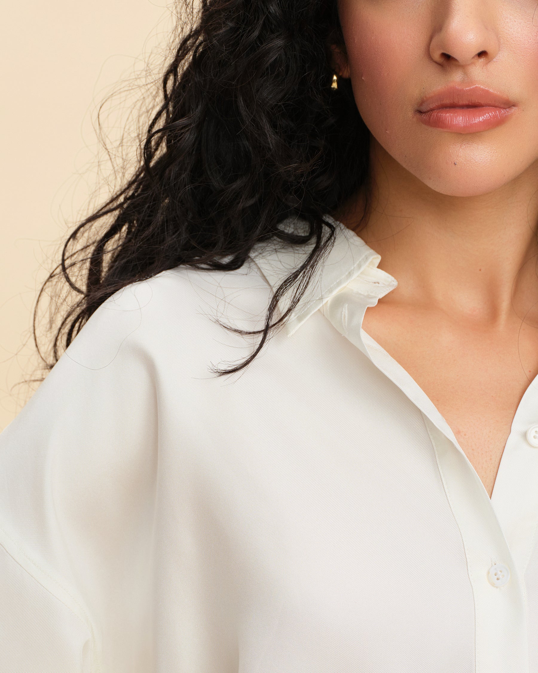 This silk blouse effortlessly blends casual and workwear elements, offering comfort for daily wear and sophistication for the office. Its versatile mid-length design works for various body types, providing a clean and flattering look that suits different styles. The H-line cut is tailored to be both comfortable and flattering, offering excellent coverage and adaptability for all body shapes. With wide cuffs that can be folded for styling versatility, this blouse brings a touch of fashion-forward flair. Made from lightweight, semi-sheer silk with a smooth, breathable texture, it’s elegant and cool to wear. The refined ivory color adds a timeless quality, showcasing minimalist elegance.