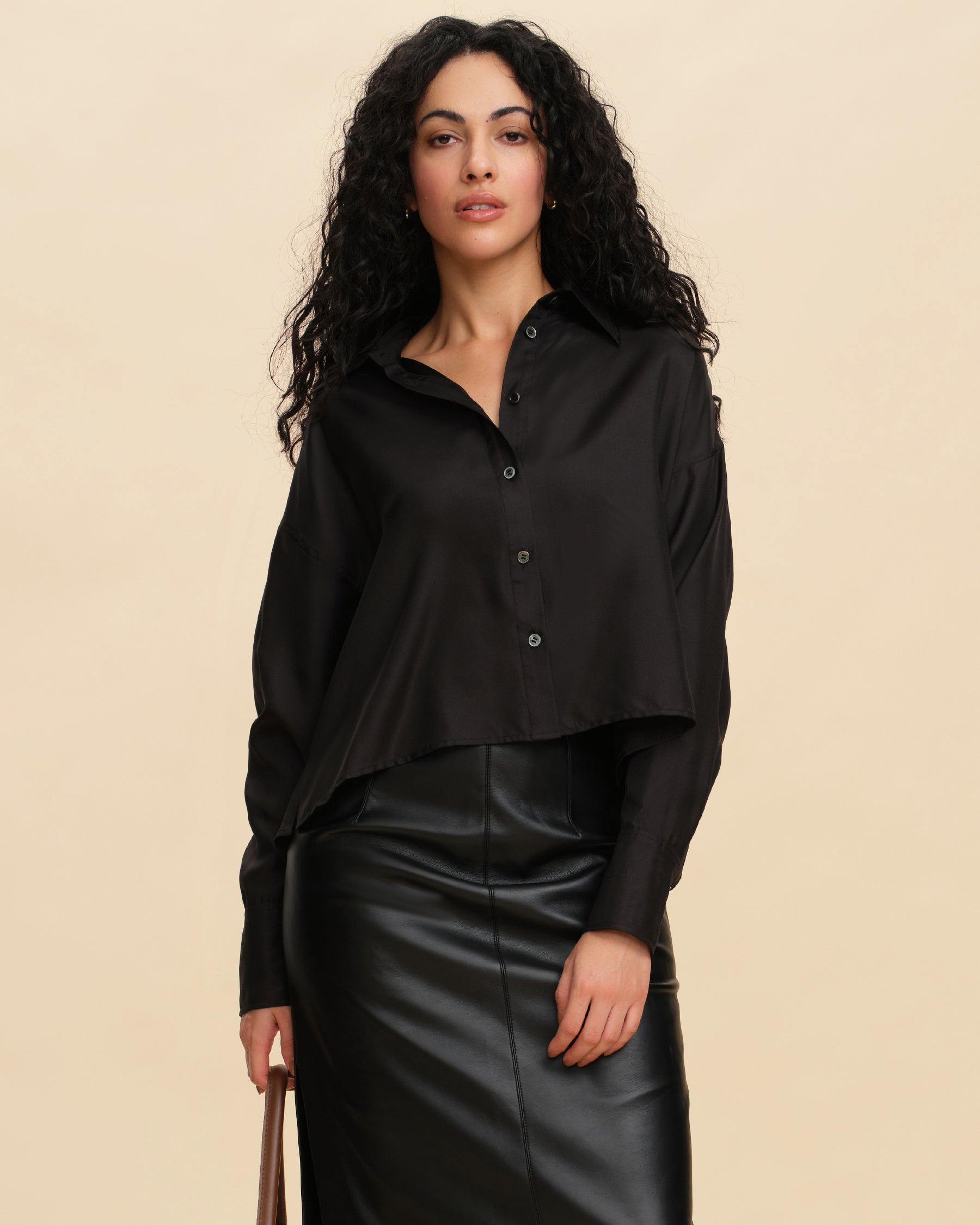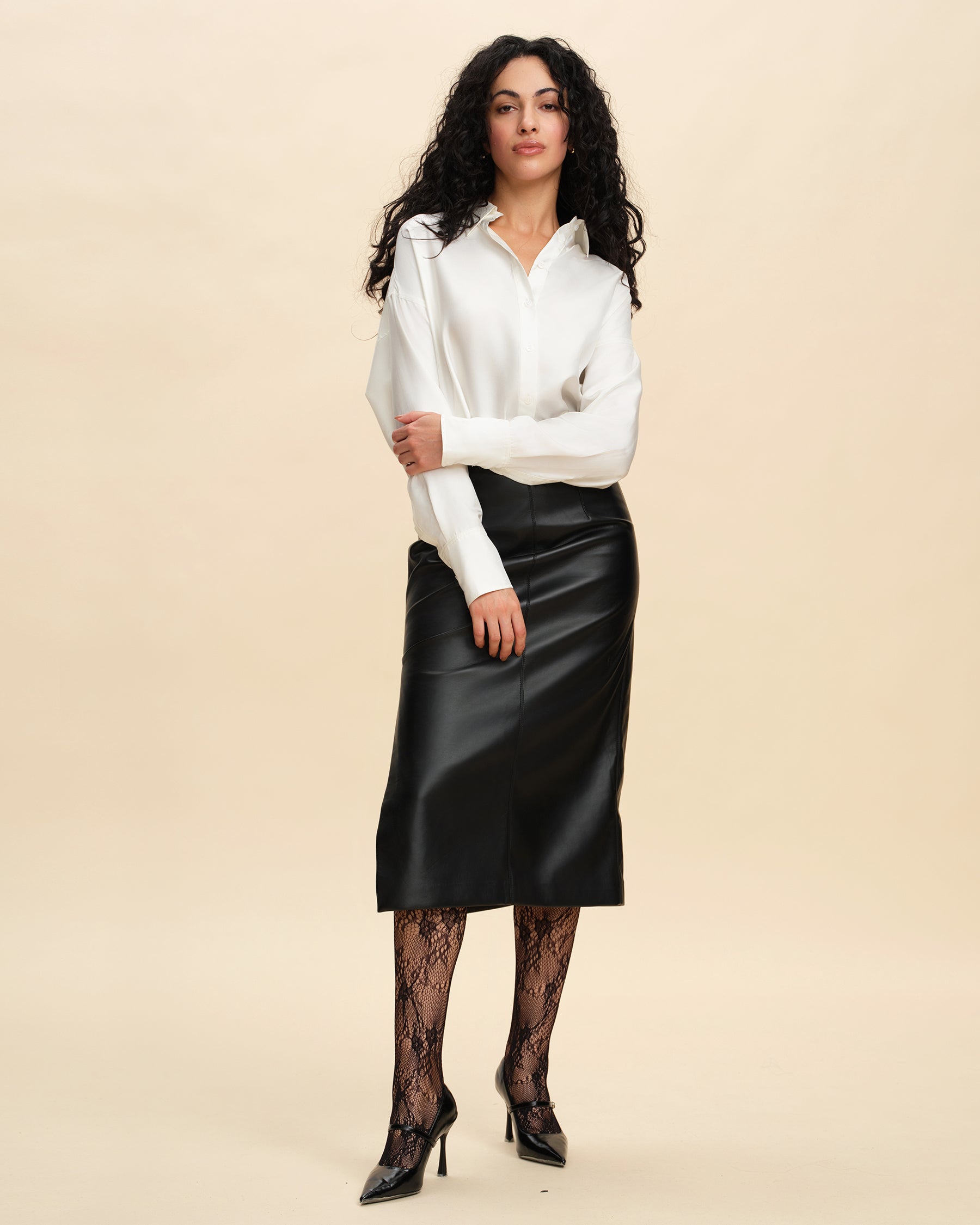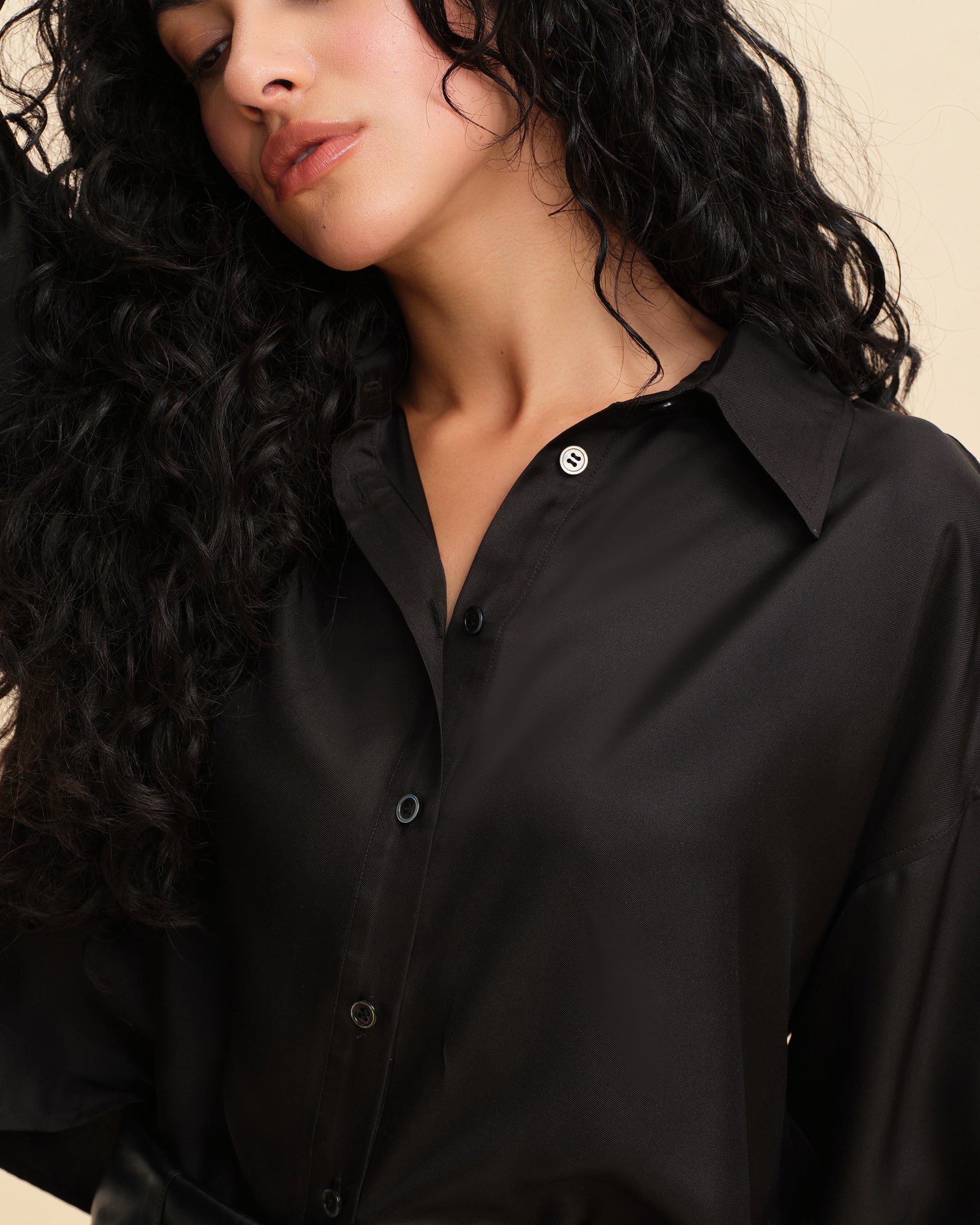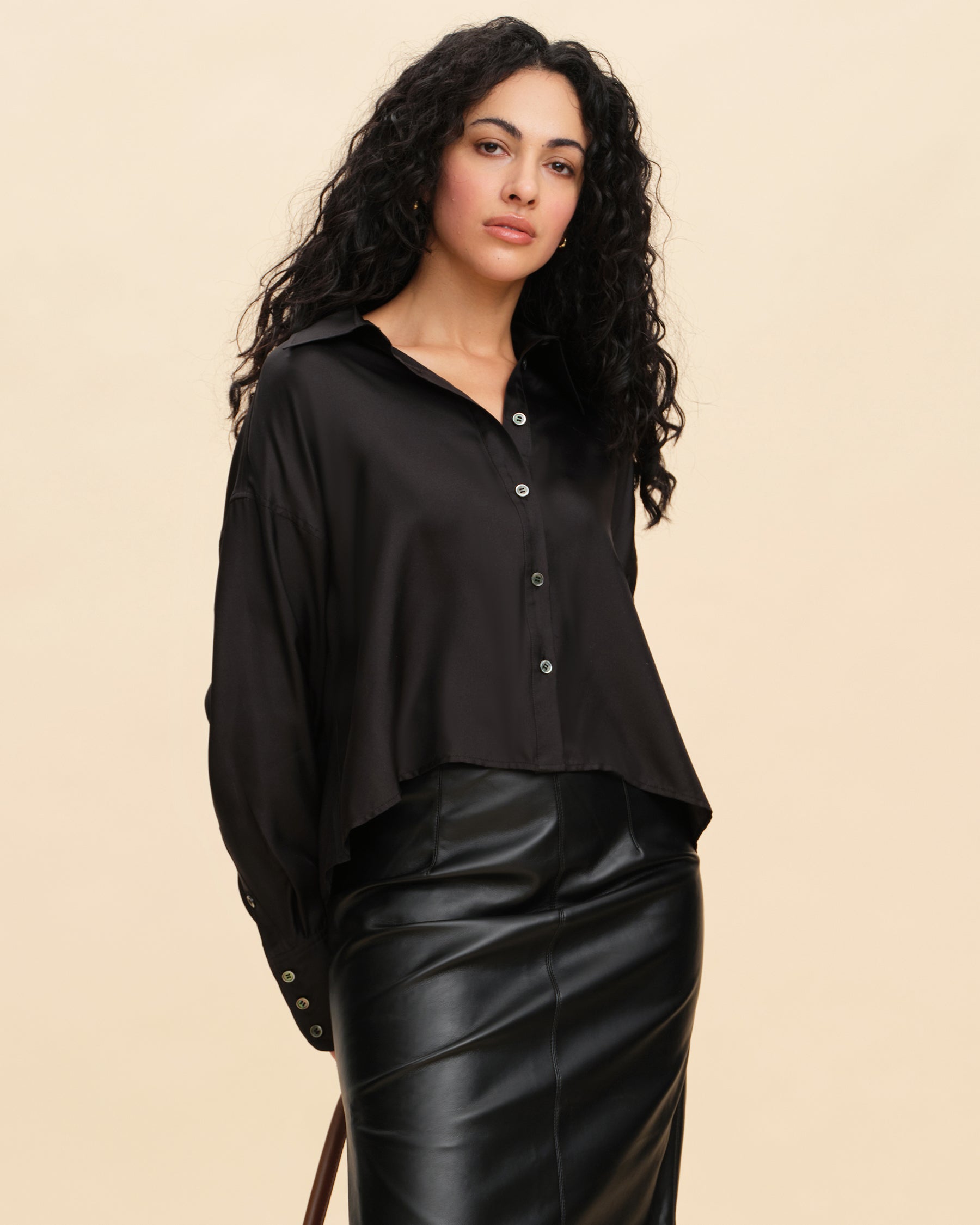 This silk blouse effortlessly blends casual and workwear elements, offering comfort for daily wear and sophistication for the office. Its versatile mid-length design works for various body types, providing a clean and flattering look that suits different styles. The H-line cut is tailored to be both comfortable and flattering, offering excellent coverage and adaptability for all body shapes. With wide cuffs that can be folded for styling versatility, this blouse brings a touch of fashion-forward flair. Made from lightweight, semi-sheer silk with a smooth, breathable texture, it’s elegant and cool to wear. The refined ivory color adds a timeless quality, showcasing minimalist elegance.
