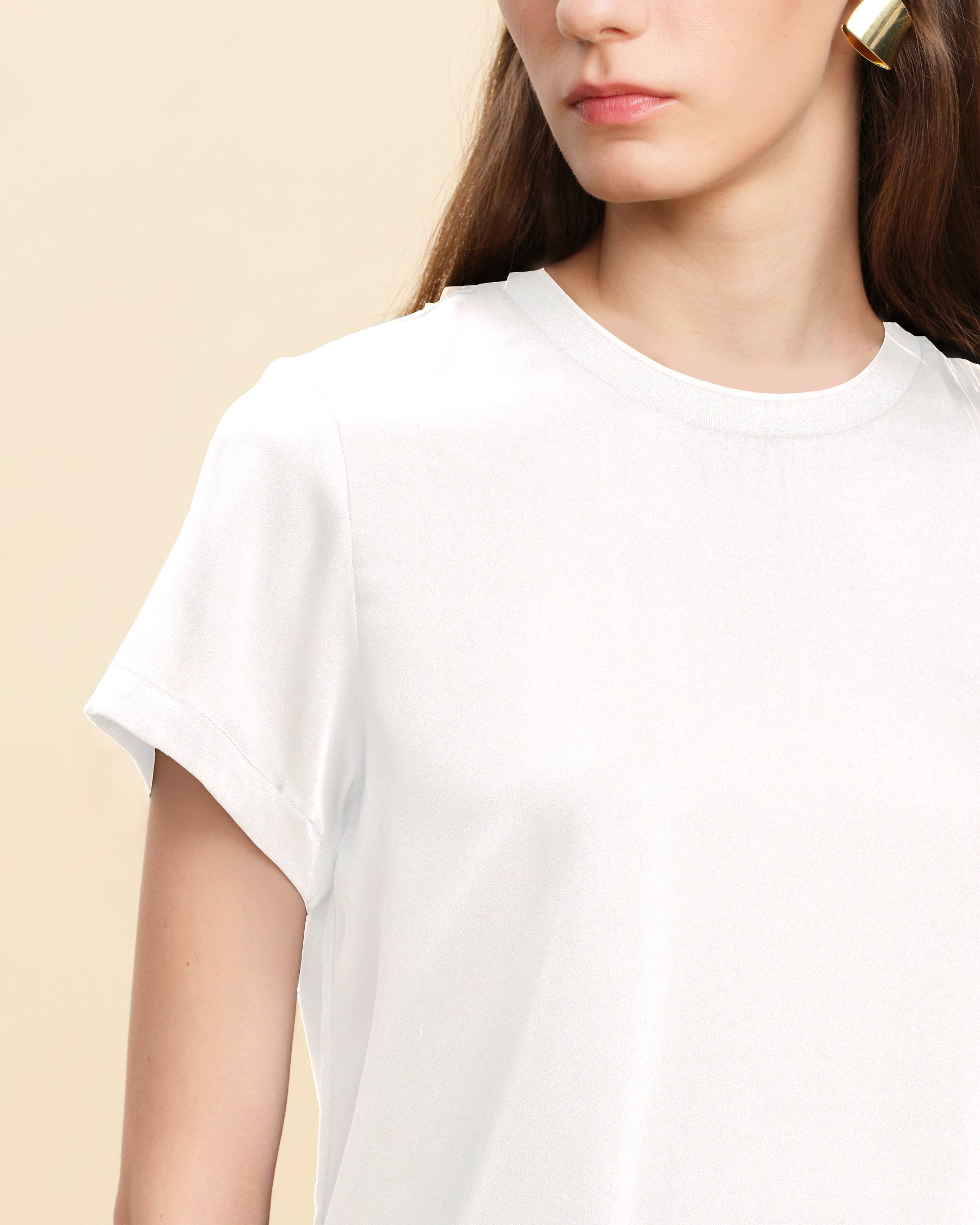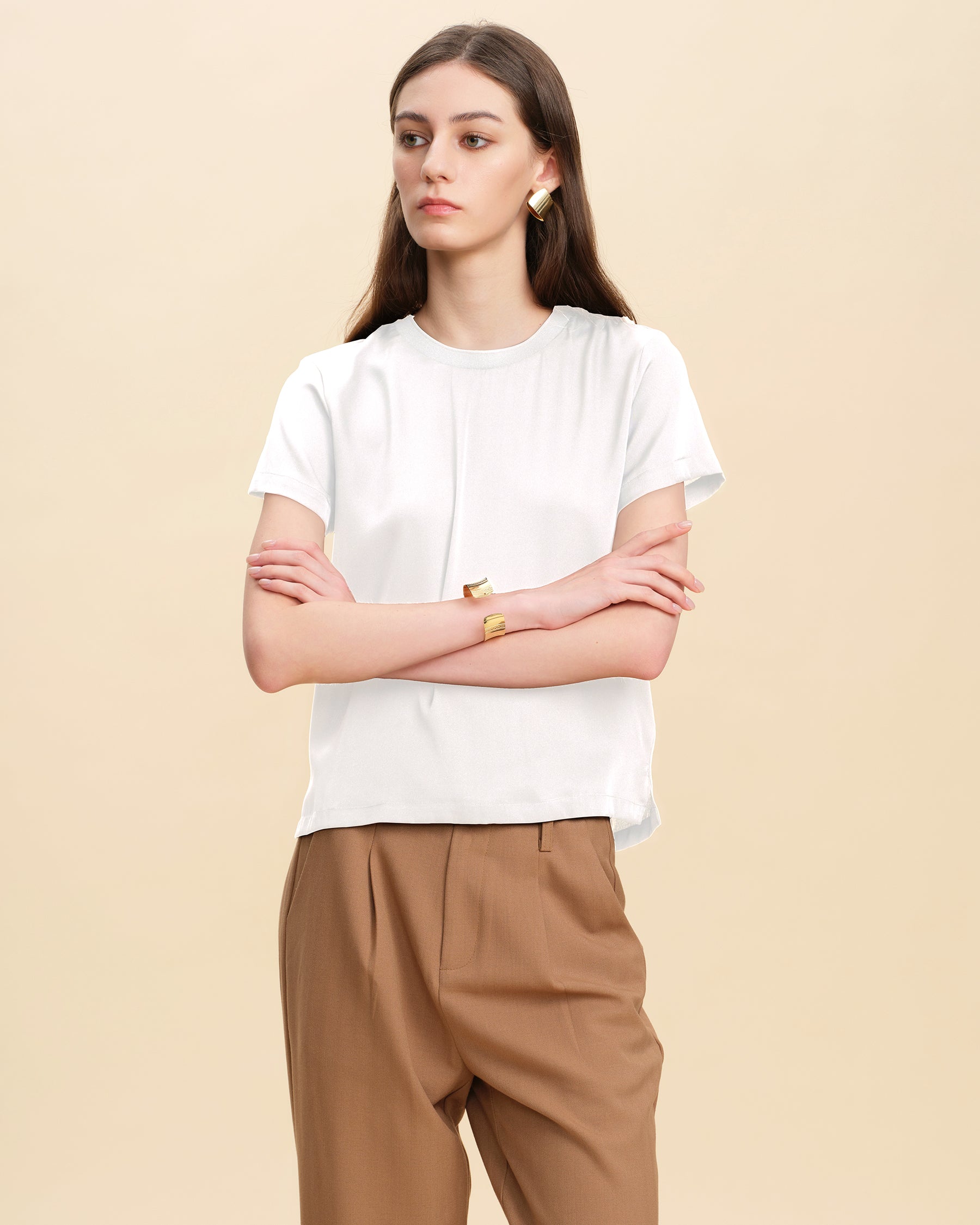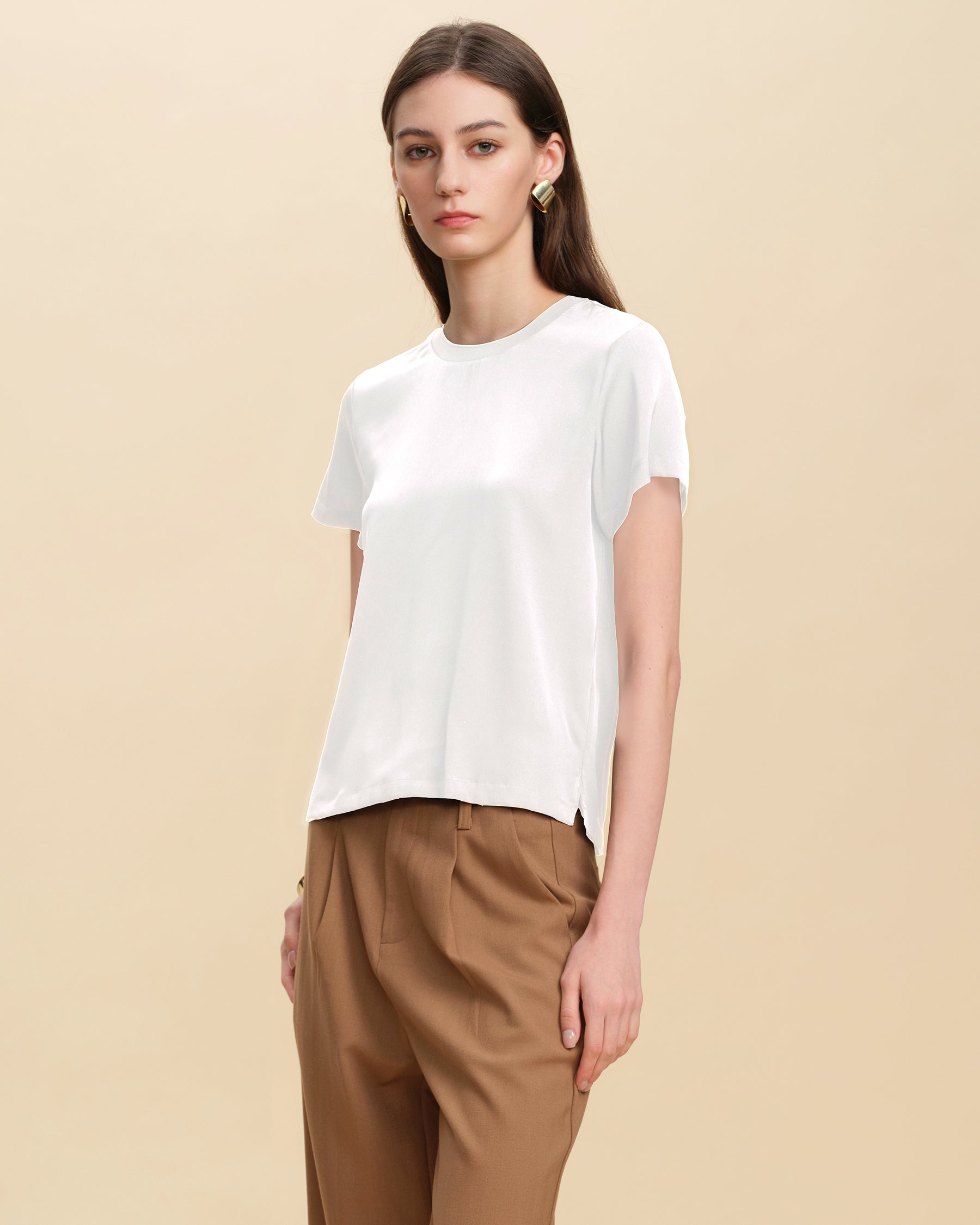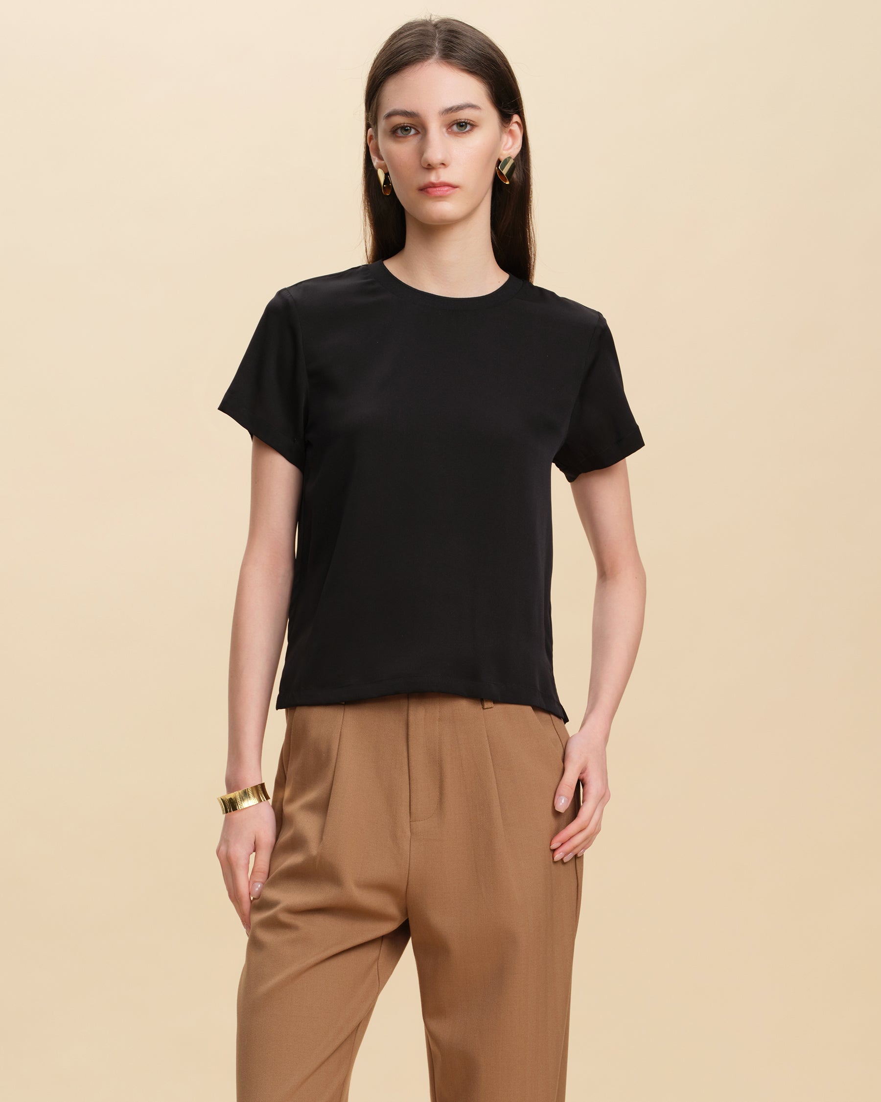 This versatile tee brings elegance and comfort together with its silk ribbed texture and thoughtfully designed details. The round neckline enhances the beauty of the neck, drawing attention to the upper body, while the structured shoulders give a polished look that subtly balances body lines. Short sleeves offer arm coverage, with a hint of ease to flatter the silhouette without restriction. The slightly relaxed fit combines comfort with a hint of roominess, making it ideal for layering or wearing solo. Lightweight silk with a delicate ribbed texture adds a touch of sheer elegance and is naturally wrinkle-resistant. This essential tee is a wardrobe staple, perfect for both inner and outer layers.