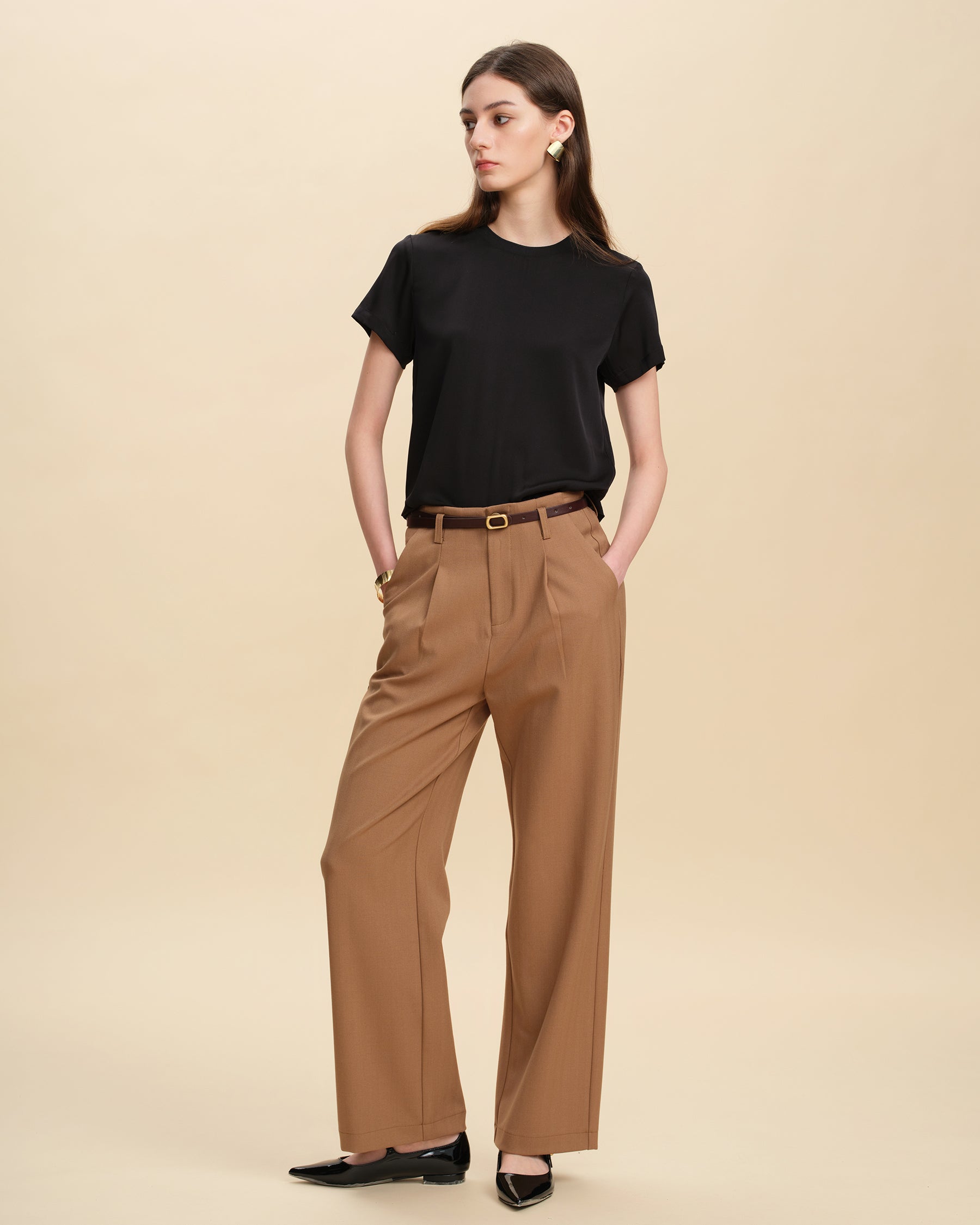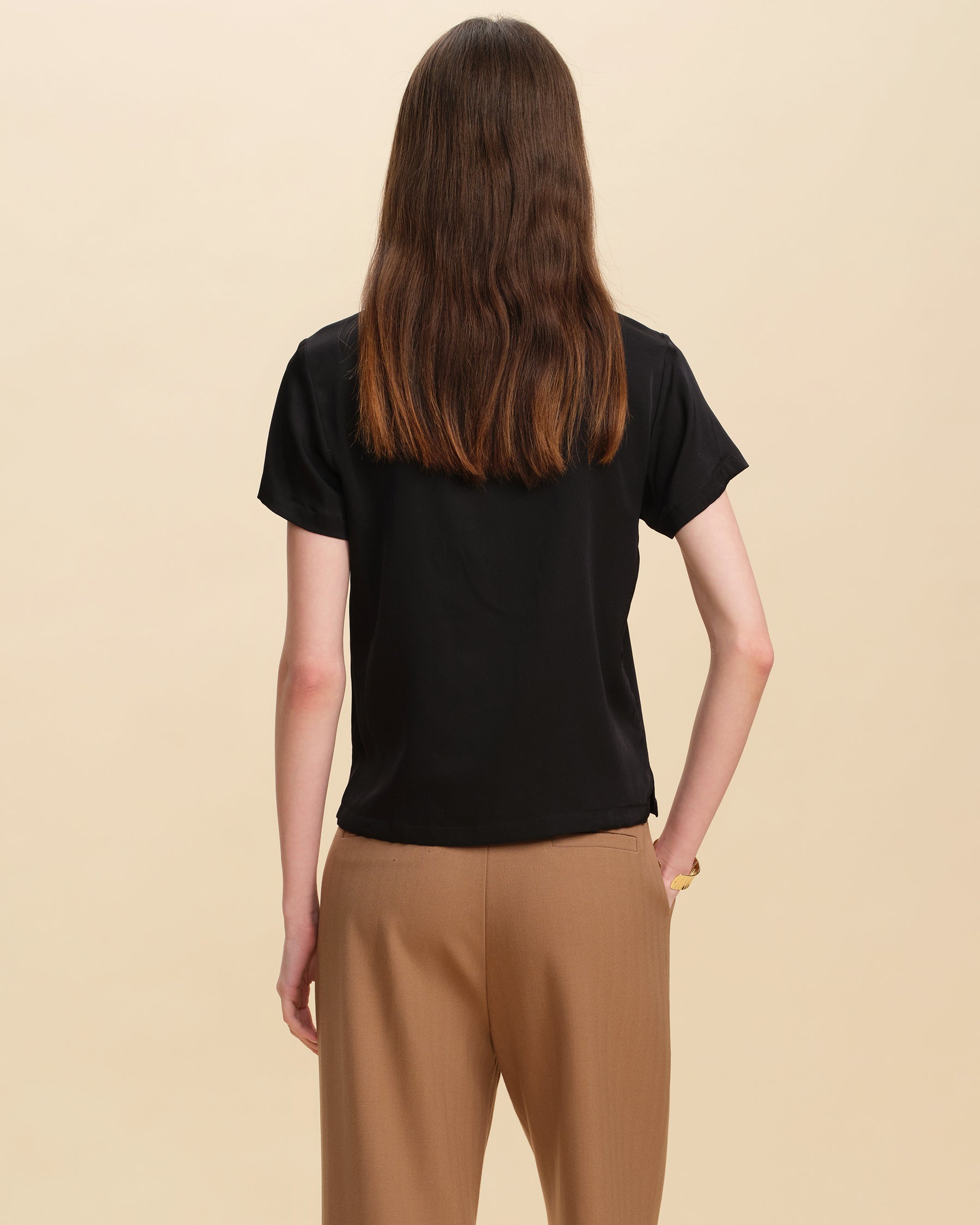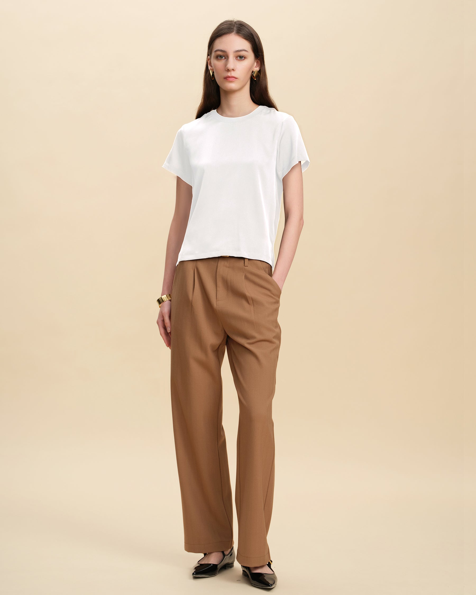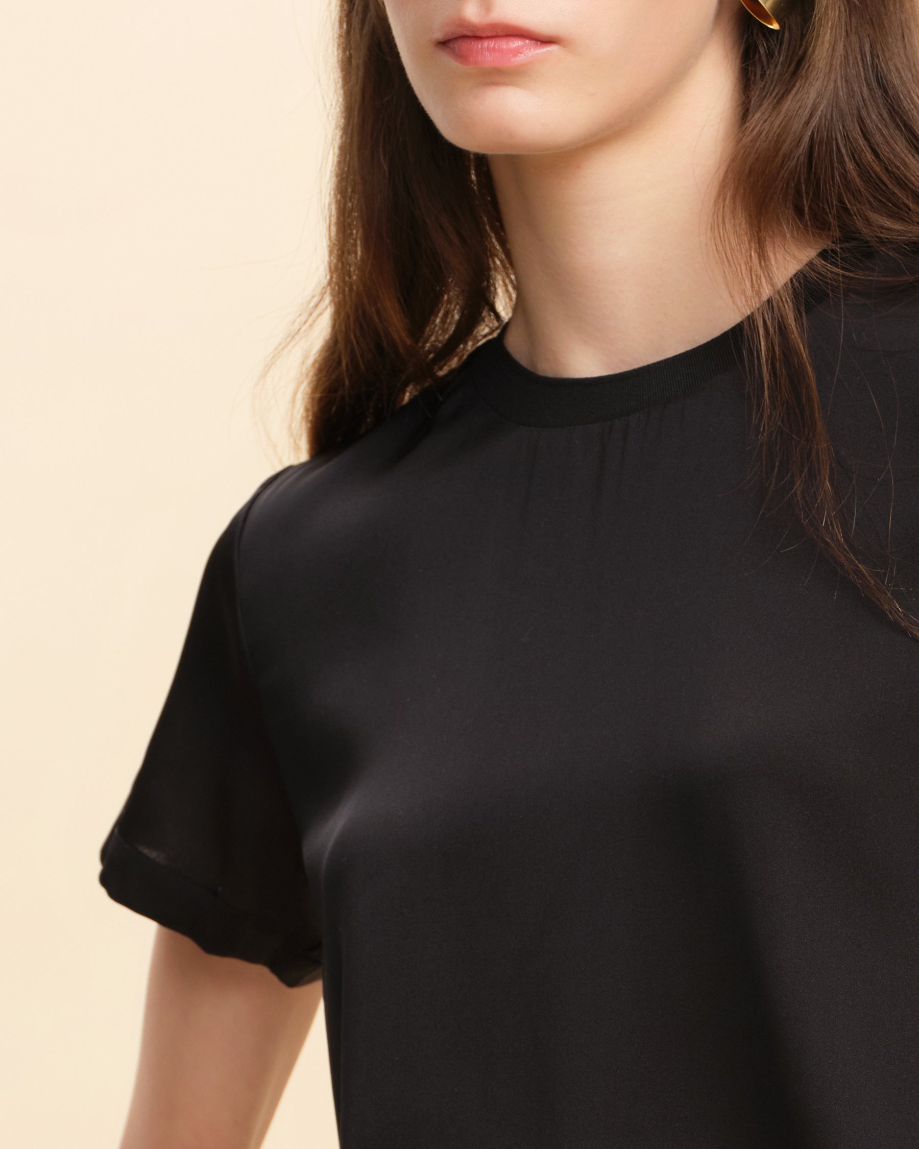 This versatile tee brings elegance and comfort together with its silk ribbed texture and thoughtfully designed details. The round neckline enhances the beauty of the neck, drawing attention to the upper body, while the structured shoulders give a polished look that subtly balances body lines. Short sleeves offer arm coverage, with a hint of ease to flatter the silhouette without restriction. The slightly relaxed fit combines comfort with a hint of roominess, making it ideal for layering or wearing solo. Lightweight silk with a delicate ribbed texture adds a touch of sheer elegance and is naturally wrinkle-resistant. This essential tee is a wardrobe staple, perfect for both inner and outer layers.